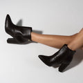- Smooth napa leather-look upper - Cocoa (dark brown) hue - Padded ankle opening - Pointy toe - Zipper on the inner side - 9cm block heel - Non-slip rubber sole