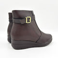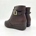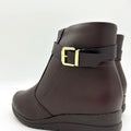 - Smooth napa leather-look upper- Coffee hue- Rounded toe- Decorative strap with a buckle - Zipper on the inner side - 3cm wedged heel- Cushioned insole - Anti-slippery rubber sole - Full memory foam lining Made in Brazil