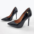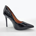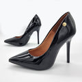 - Patent leather-look upper- Black hue- Pointed toe- Low-cut vamp- Polished metal branded applique to the outer quarter- 11cm covered stiletto heel- Extra comfort rubber sole- Memory foam liningMade in Brazil
