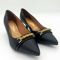 Crafted from smooth black faux leather, these pumps feature a bamboo-inspired buckle detail, adding a touch of elegance. A cushioned insole ensures lasting comfort, making them as practical as they are stylish.The classic black hue makes these pumps endlessly versatile. Pair them with a tailored blazer for a sharp office look or a sleek dress for an effortlessly chic evening outfit.
